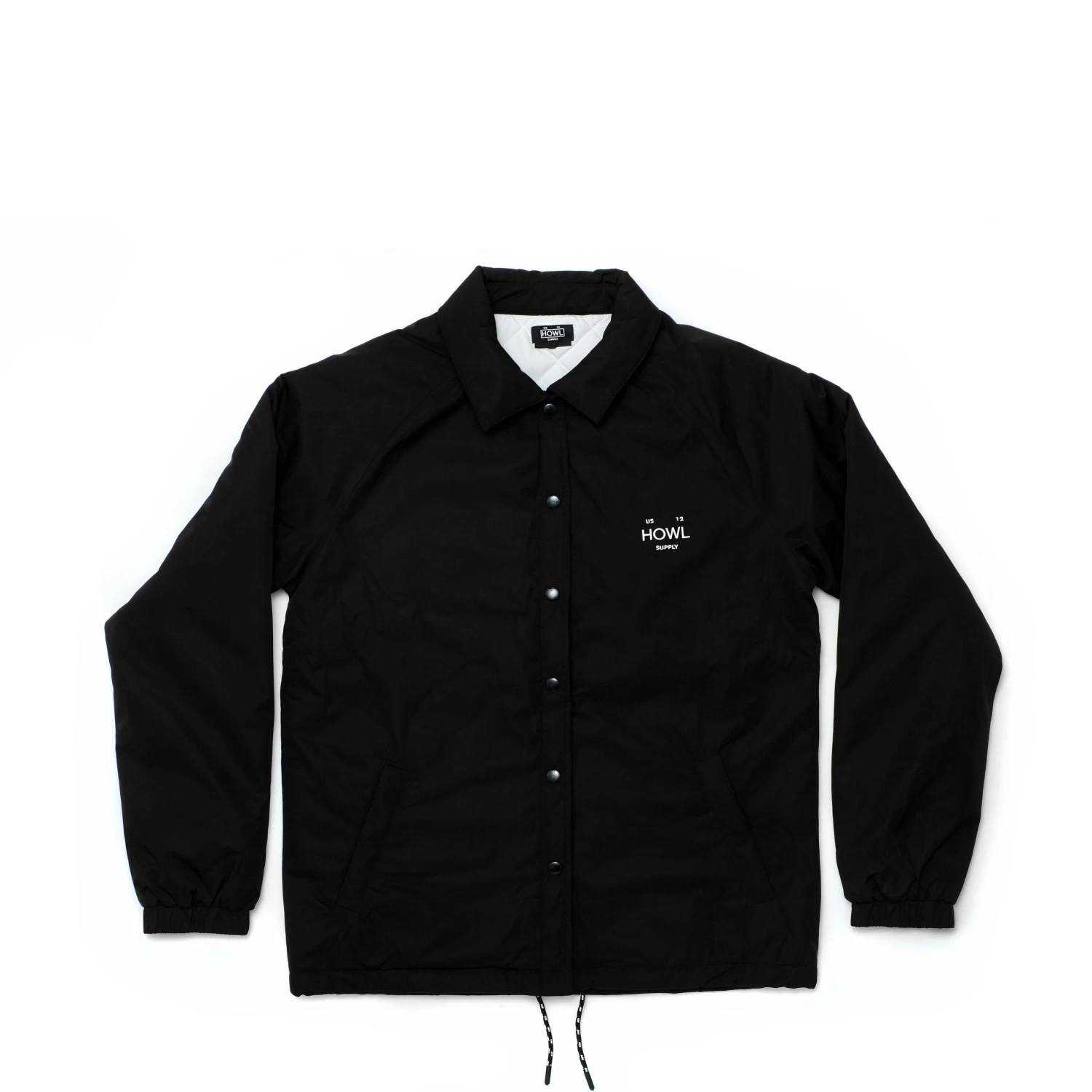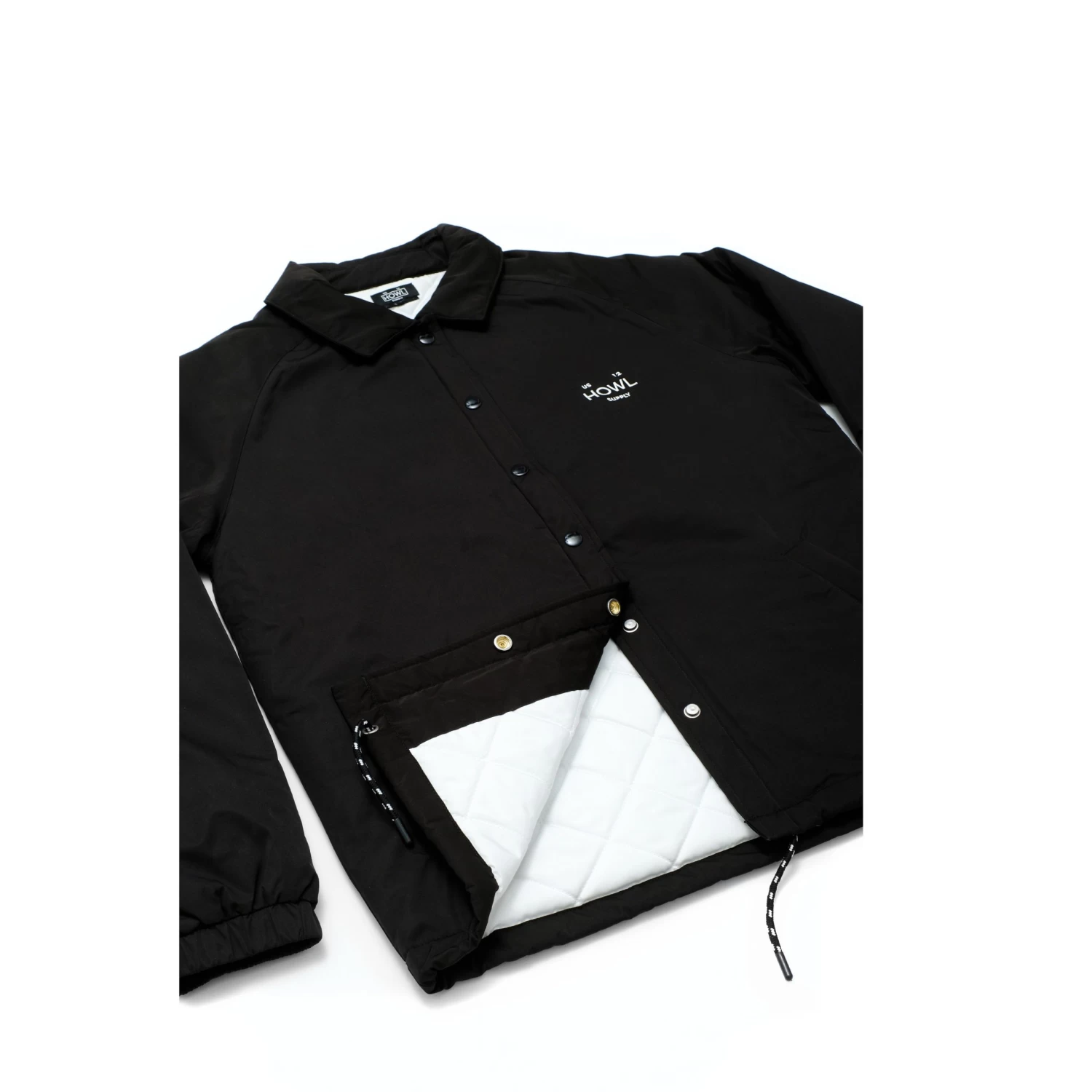 Insulated nylon shell with diamond quilted lining, drawstring hem adjustment with elastic cuff.
